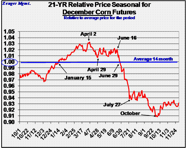 Broad marketing recommendations are based on seasonal charts, fundamental data, and technical indicators. Specific recommendations to clients are adjusted to reflect personal cash flow needs, risk level, available storage, and other variables. Seasonal price history is the cornerstone of the broad marketing recommendations. I have created "Relative Price Charts" for both futures and cash markets that provide a guide for disciplined marketing. There is nothing magic or unique about price history. Markets are usually lower when supplies available for sale are large and concern about crop production is low . . . and prices are usually high when available supplies are small and concern about the next crop is large. Pricing grain during the "selling season" identified by long-term historical price action is right most of the time.